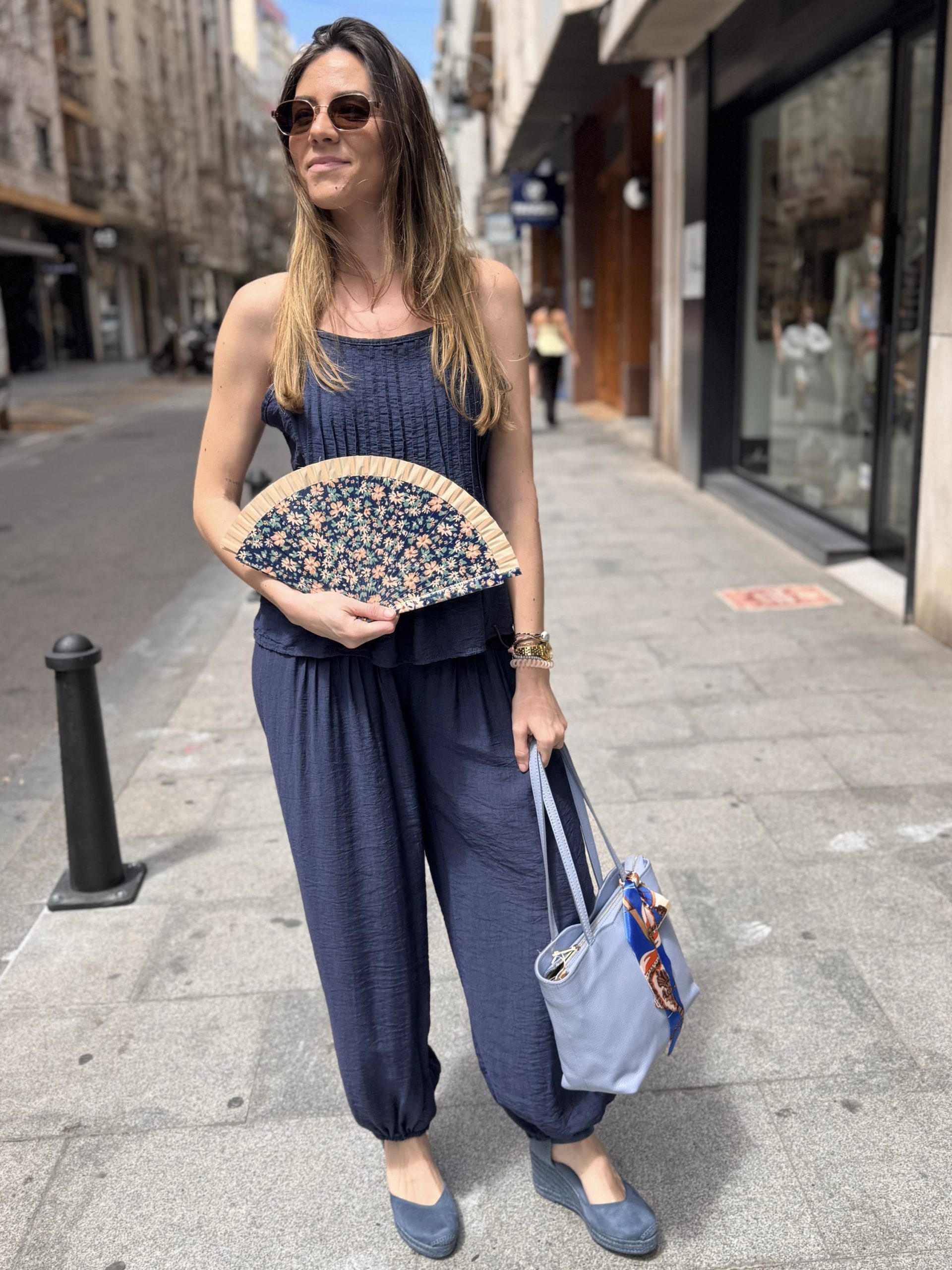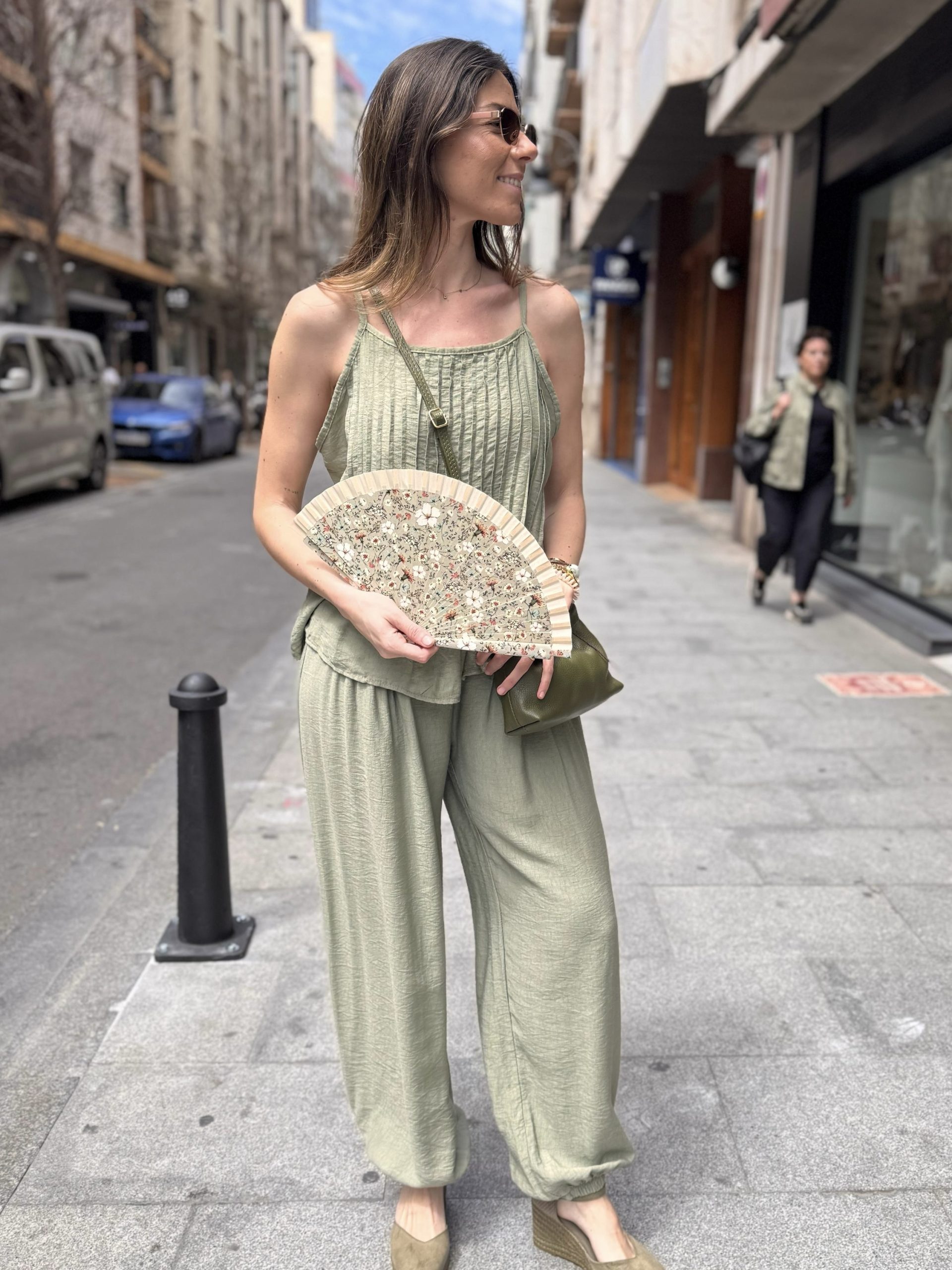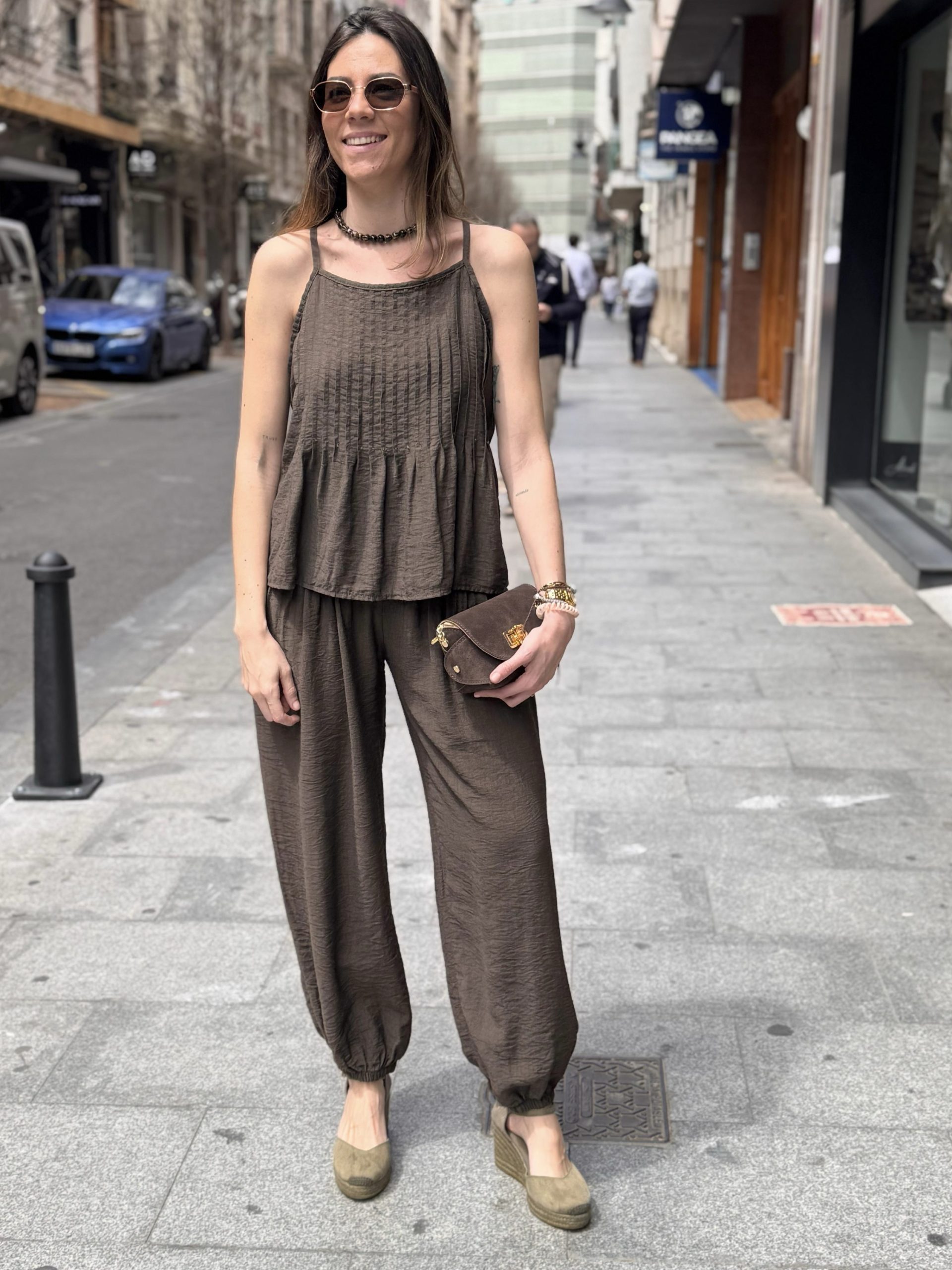 PANTALÓN DE VISCOSA CON JARETAS DELANTERAS Y GOMA EN EL BAJO, ESTILO BOMBACHO. A JUEGO CON EL TOP TIRANTES JARETAS. APROX HASTA UNA 40.